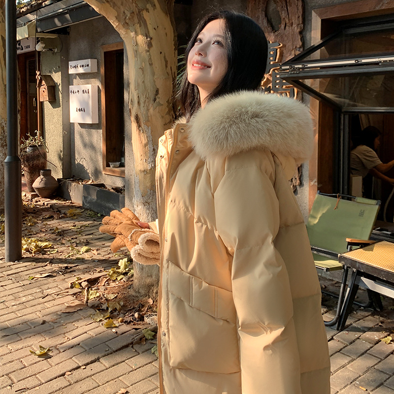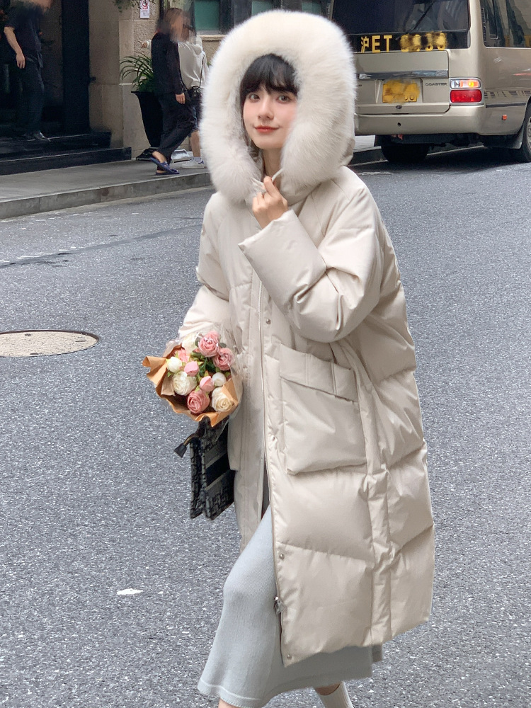ボリュームのあるファー、厚手でミディアム丈、シンプルな韓国スタイルで、寒い冬の防寒対策にぴったり